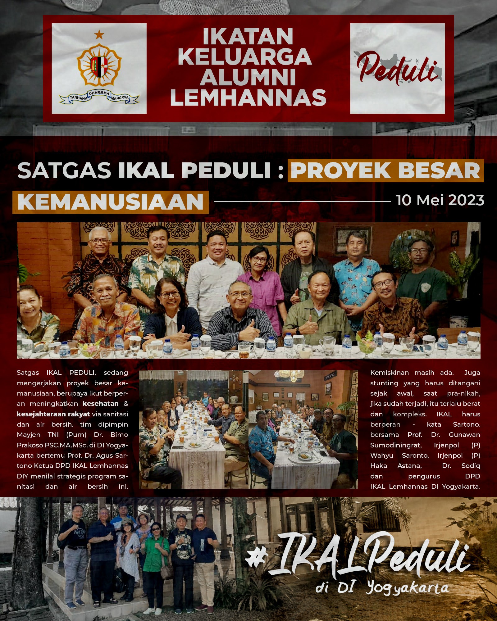 <p>Satgas IKAL PEDULI, sedang mengerjakan proyek besar kemanusiaan, berupaya ikut berperan meningkatkan kesehatan dan kesejahteraan rakyat melalui sanitasi dan air bersih. Tim dipimpin Mayjen TNI (Purn) Dr. Bimo Prakoso PSC.MA.MSc. di DI Yogyakarta bertemu Prof.Dr. Agus Sartono Ketua DPD IKAL-Lemhannas Provinsi DIY menilai strategis program sanitasi dan air bersih ini. Kemiskinan masih ada, Juga stunting yang harus ditangani sejak awal, saat pra nikah, jika sudah terjadi, itu terlalu berat dan kompleks. IKAL harus berperan kata Sartono. bersama Prof.Dr. Gunawan Sumodiningrat, Irjenpol (P) Wahyu Saronto, Irjenpol (P) Haka Astana, Dr. Sodiq dan pengurus DPD IKAL-Lemhannas Provinsi DIY tanggal 10 Mei 2023</p>