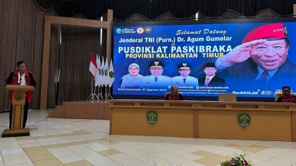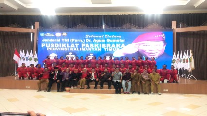 Ketua Umum DPP IKAL-Lemhannas Jenderal TNI (Purn) Agum Gumelar memberikan sambutan dan pembekalan kepada para anggota Paskibraka Provinsi Kalimantan Timur pada acara Pusdiklat P..